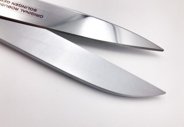 Vonkajšie nože sú poniklované, vnútorné a vonkajšie čepele sú pochrómované pre extra ochranu proti korózii. Vhodné na prírodné vlákna, jersey a trikotové tkaniny, vlnené a pletené materiály, tenké kože, kožušiny. Ideálne na rezanie napríklad hladkých syntetických vlákien, záclon, tenkej kože, kožušiny, hodvábu a dekoratívnych látok. Na jednej čepeli mikrozúbky na strihanie bez preklzu. Extrémne jednoduchá manipulácia a ovládanie. Absencia neprimeranej fyzickej námahy v dôsledku efektu „posilňovača riadenia“. Vnútorná pružina = inštalovaná v otočnom bode pre pohodlné a spoľahlivé strihanie. Vyrobené z vysoko kvalitnej uhlíkovej ocele C60 (cca 59HRC). Zlaté pravidlo: Čím silnejší je materiál, tým väčšia je veľkosť nožníc! Modro leštené čepele (proces tzv. modrého leštenia je skutočným remeselným umením a zároveň významným prvkom, ktorý je charakteristický pre kvalitu nožníc ROBUSO. Nožnice opracované procesom modrého leštenia majú veľmi jemný profil, ktorý dáva pod svetlom modrý odlesk. Výkon takýchto nožníc je vzhľadom povrchových nedostatkov nezanedbateľne vyššie a nožnice sú vďaka nemu zároveň chránené proti hrdzi.). Práškovo lakovaný povrch rukovätí (nožnice ROBUSO na technické textílie s práškovo lakovanými rukoväťami vynikajú predovšetkým štruktúrovaným, ľahko uchopiteľným povrchom rukovätí; riadeným strihaním, dokonca aj v klzkých rukách alebo v rukaviciach od oleja; aj vysokou odolnosťou proti korózii, chemikáliám; manipuláciu v sťažených podmienkach ako je napr. horúco, pot, vlhkosť; dlhou životnosťou). Materiál: uhlíková oceľ (CS), (C60)