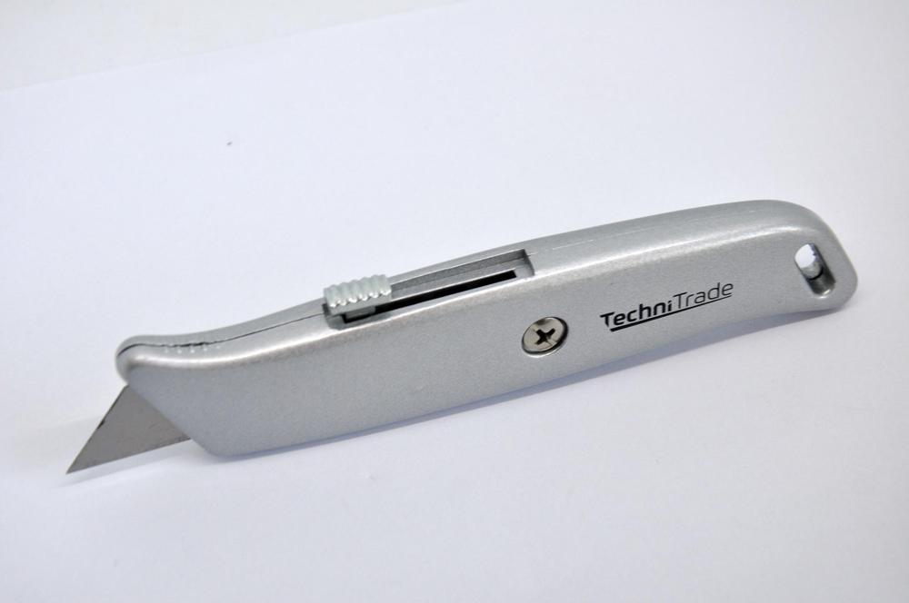 Všestranne použiteľný nôž s ručným zaťahovaním čepele. Vysoko kvalitný kovový nôž. Ergonomický tvar rukoväte zaisťuje vyšší komfort pri práci. Rozmery: 150x35x15mm Inštalovaná čepeľ: trapézový čepeľ č. 1030.0650