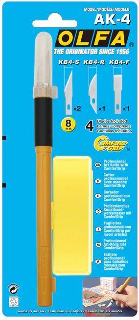 Kvalitný ceruzkový skalpel OLFA AK-4. opatrený dlhšou rukoväťou pre väčšie pohodlie pri práci, určený pre veľmi jemné práce. Inštalovaná čepeľ: Skalpelová čepeľ KB4-S/5 Ďalšie náhradné čepele v cene noža: 1x čepeľ KB4-S/5, 1x čepeľ KB4-R/5, 1x čepeľ KB4-F/5 Rozmery: 140x7x7 mm