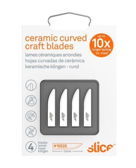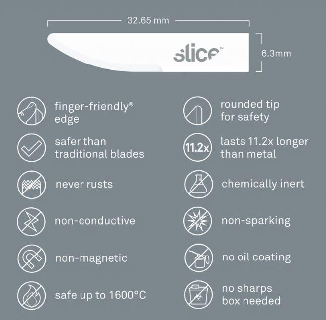 4 ks jednostranných zakrivených čepelí so zaoblenými špičkami. Bezpečnejšia vďaka Finger-friendly hrane ako klasické kovové čepele. Poskytujú 11,2x dlhšiu dobu používania ako oceľ. Odolnosť teplote od -40 až 1600 °C. Bezpečnostné čepele SLICE sú chemicky ľahostajné, nemagnetické, nevodivé, neiskrivé, nehrdzavejúce bez potreby mazania. Na výmenu čepelí nie sú potrebné žiadne nástroje. Kompatibilné nože: 10548, 10589, 10580, 10568 Rozmery: 32,65x6,3x0,5mm