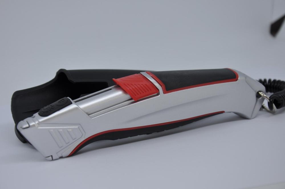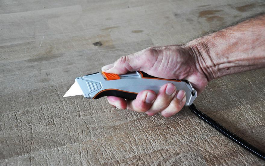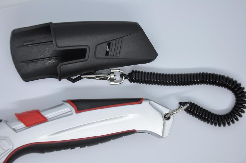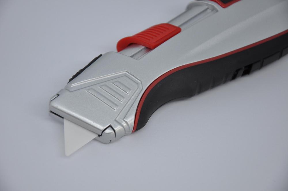 Čepeľ je ovládaná pružinou. Masívne rukoväť. Jednoduchý dizajn. Vhodný pre pravákov aj ľavákov. Zaisťuje tak vyšší komfort pri práci. Nôž s inštalovanou trapézovou čepeľou, ktorú možno 2x otočiť. Spoľahlivá pružina ovládajúci čepeľ, bezpečná a rýchla výmena čepele. Ergonomicky tvarované kovové telo je vyrobené z ľahkej zliatiny, gumená rukoväť padne dobre do ruky a zamedzuje preklzávaniu noža. Telo noža obsahuje zásobník, do ktorého možno umiestniť až päť náhradných čepelí. Rozmery 167x39x19,5mm Váha: 107 g. Inštalovaná čepeľ: Keramická trapézová čepeľ 1007.060.50