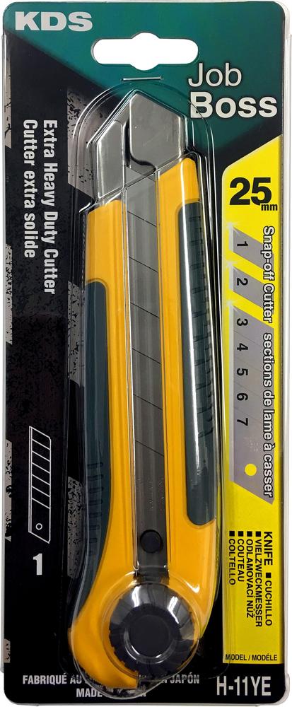 Vysokokvalitný profesionálny vypínací nôž H-11 kompatibilný so všetkými typmi 25 mm čepelí. Tento ergonomický nôž je vyrobený z kvalitného tvrdeného plastu v kombinácii s protišmykovou gumou. Nôž je vybavený 0,7 mm hrubou čepeľou. Vhodné na rezanie tvrdších materiálov, ako sú koberce, izolačné materiály, sadrokartónové dosky atď. Jednoduchým otočením čepele je nôž pripravený na používanie ľavou rukou. Skrutkový typ zámku čepele. Rozmery: 180x45x20 mm Inštalovaná čepeľ: HB-BH - čiernená