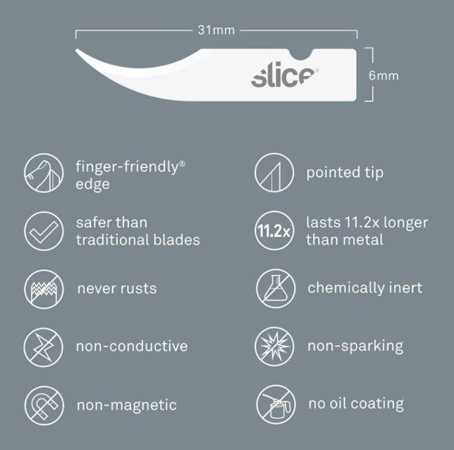 Bezpečnostné čepele SLICE sú chemicky ľahostajné, nemagnetické, nevodivé, neiskrivé, nehrdzavejúce bez potreby mazania.