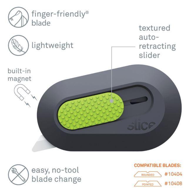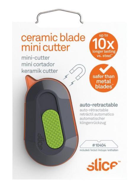 Univerzálny bezpečnostný rezač americkej značky SLICE s keramickou čepeľou. Rezák má mikro keramickú čepeľ, ktorá je bezpečnou náhradou za nožnice alebo za tradičné bezpečnostné nože. Slice 10514 je ideálna na odstraňovanie zmršťovacích fólií, rezanie a vystrihovanie tenkých materiálov, plastových obalov, papiera, roliek a pod. V rezáku je vstavaný magnet, povrch je pogumovaný a protišmykový. Nôž SKU 10514 je obojstranný, ľaváci potrebujú iba po dodaní presunúť čepeľ do protiľahlej drážky Výhody keramickej čepele: dlhšia životnosť oproti oceľovým čepeliam, vysoká bezpečnosť (s keramickými čepeľami SLICE je takmer nemožné porezať), nevedú elektrinu, zostávajú dlho ostré a nehrdzavie. Možnosť zavesenia na kľúče Na výmenu čepelí nie sú potrebné žiadne nástroje. Kompatibilné čepele: 10404, 10408. Rozmery: 62 x 38 x 11,6 mm. Váha: 18g