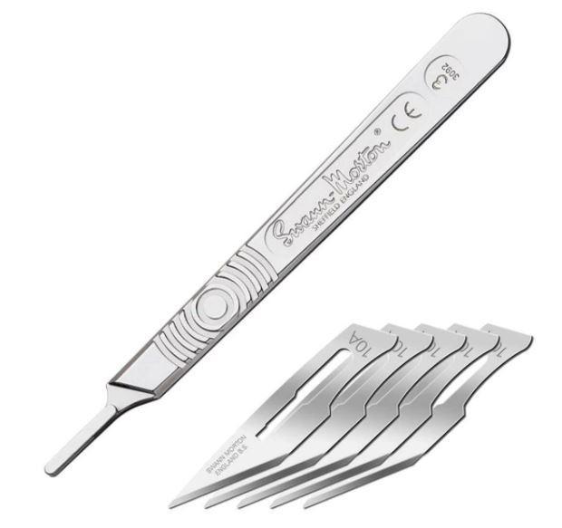 Skalpelová držiak H1071 je oceľový držiak chirurgického tvaru typizovaného č. 3, pre priemyselné skalpelové žiletky. Výmena čepieľky sa prevádza manuálne. Skalpel je vhodný pre všetky typy skalpelových čepeľou s menším vnútorným otvorom Dodávané bez čepele.