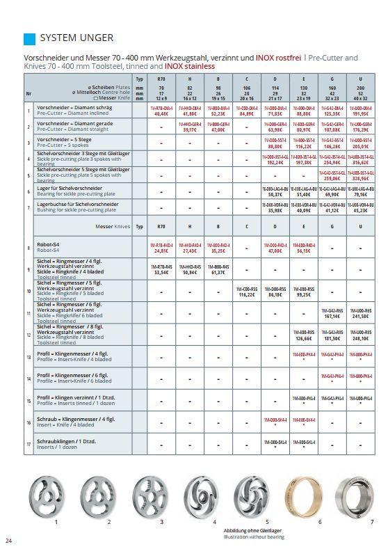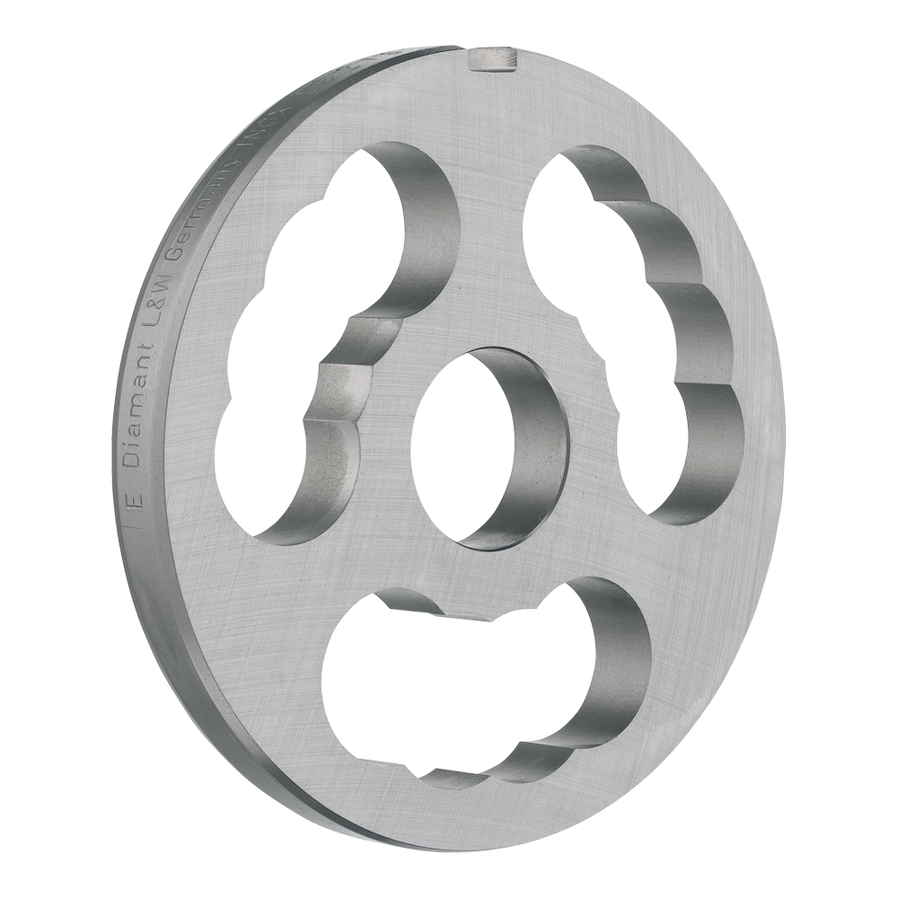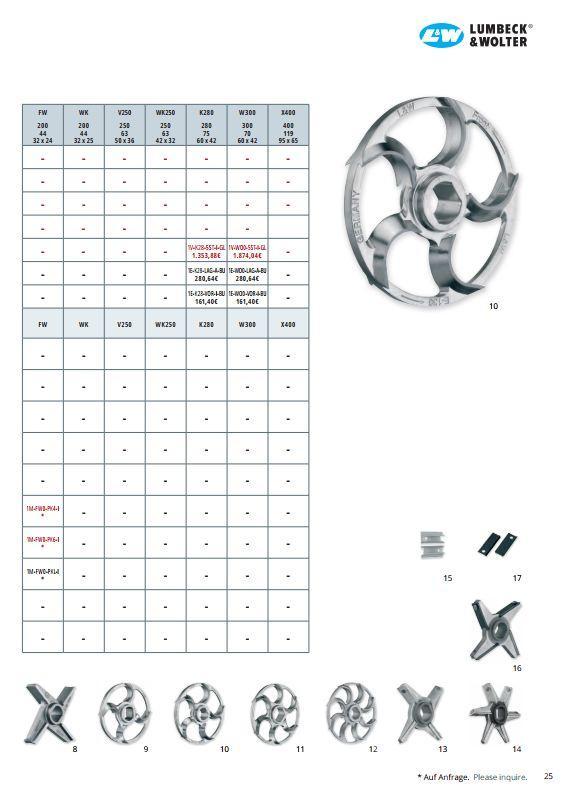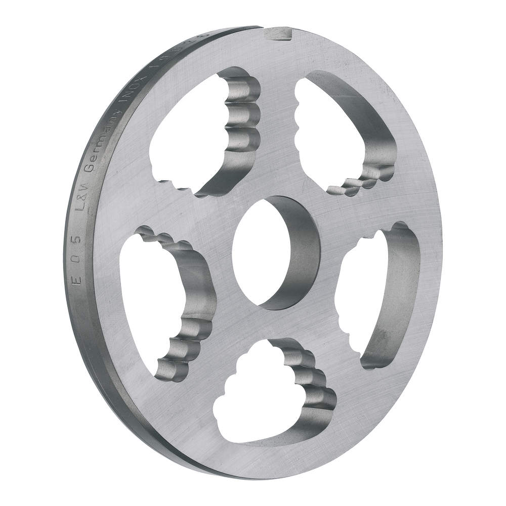 Předřezávač UNGER INOX od výrobce Lumbeck & Wolter je součástí řezné sady profesionálních mlýnků na maso používaných v řeznictvích, gastronomii i potravinářském průmyslu. Předřezávač představuje první stupeň drcení v řezné sadě mlýnku, který připravuje surovinu pro další nože a mlecí desky. Jeho úkolem je zajistit optimální průtok materiálu do následujících částí řezné sady, čímž přispívá k rovnoměrnému mletí a stabilnímu výkonu mlýnku. Předřezávače jsou vyrobeny z kvalitní nerezové oceli INOX, která je odolná proti korozi, hygienická a vhodná pro použití v potravinářských provozech. Díky precizní výrobě a robustní konstrukci mají dlouhou životnost i při intenzivním profesionálním použití. Výrobek je vyráběn podle normy DIN 9805, která definuje rozměry, materiál a konstrukci komponentů řezných sad pro mlýnky na maso. Předřezávače jsou dostupné v různých tvarech a velikostech podle typu mlýnku a konkrétní aplikace. Materiál: nerezová ocel INOX (stainless steel) Typy provedení: - srpový předřezávač (3 břity) - srpový předřezávač (5 břitů) - 5paprskové provedení - diamantové provedení – šikmé - diamantové provedení – rovné Průměr (typ stroje): R – 70 mm; H – 82 mm; B – 98 mm; C – 106 mm; D – 114 mm; E – 130 mm; G – 160 mm; U – 200 mm; K – 280 mm; W – 300 mm