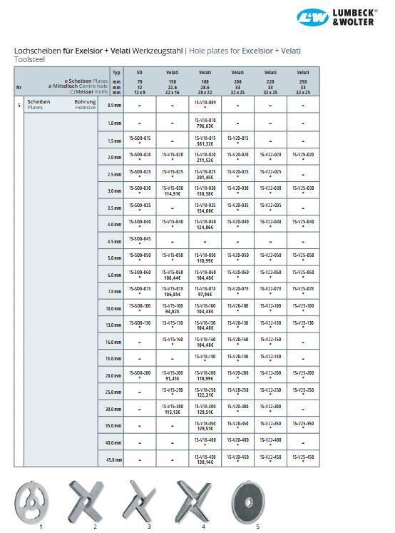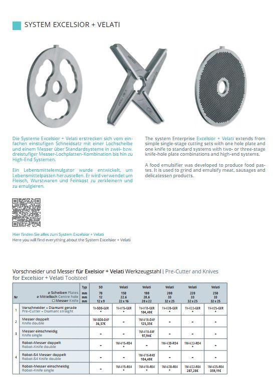 Řezný nůž systému Excelsior / Velati od výrobce Lumbeck & Wolter je určen pro profesionální mlýnky na maso používané v potravinářském průmyslu, řeznictvích a gastronomii. Nůž je součástí řezné sady systému Excelsior / Velati, kde spolupracuje s mlecí deskou a dalšími komponenty řezného systému a zajišťuje efektivní a rovnoměrné zpracování surovin. Systém Excelsior / Velati umožňuje různé konfigurace řezných sad – od jednoduchých kombinací jedné desky a nože až po vícestupňové sestavy s vyšším výkonem. Tyto systémy se používají zejména při zpracování masa, výrobě uzenin a dalších potravinářských výrobků. Nože jsou vyráběny z kvalitní nástrojové oceli, která zajišťuje vysokou odolnost proti opotřebení, dlouhou životnost a stabilní výkon i při intenzivním profesionálním provozu. Materiál: nástrojová ocel (Toolsteel) Typ nože: - dvojitý / 4-břitý - jednostranný / 4-břitý - Robot dvojitý / 4-břitý - Robot jednostranný / 4-břitý - Robot-S4 Průměr (typ stroje): - SO – 70 mm - Velati – 150 mm - Velati – 180 mm - Velati – 200 mm - Velati – 220 mm - Velati – 250 mm
